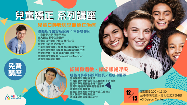 “雅緹斯兒童矯正系列講座” 這次邀請到台灣耳鼻喉科醫學會專科—張明璋醫師與齒顎矯正專科—陳易駿牙醫博士,來告訴我們孩子的鼻過敏問題及牙齒發育異常之間的關係,讓孩子能夠在成長發育的階段早期發現問題早期治療,避免影響到孩子未來的顏面外觀及咬合功能。